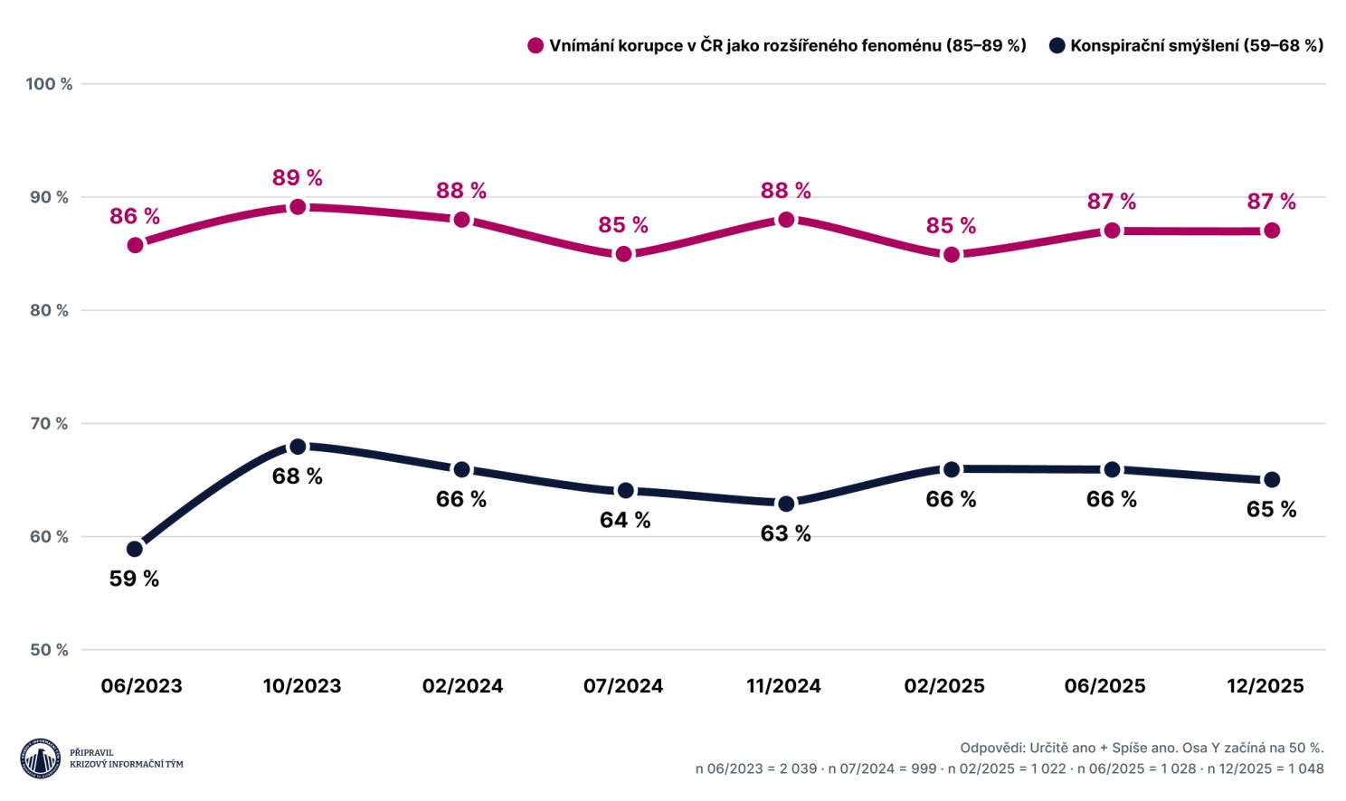 Přesvědčení, že Česko je zkorumpované, sdílí 85 až 89 % populace. Stabilně, bez výkyvů, po celé sledované období.