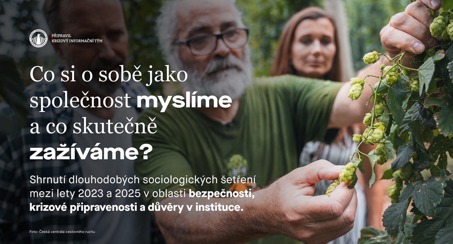 Česko je jedna z nejbezpečnějších zemí světa. Víme to – a přesto si vyprávíme příběh o společnosti, která se prý rozpadá. Osm vln výzkumu mezi lety 2023 a 2025 ukazuje, že obraz, který si o sobě vytváříme, se výrazně liší od toho, co skutečně zažíváme – a že právě ten obraz může oslabovat důvěru, ochotu udržovat bezproblémové soužití i odolnost společnosti.