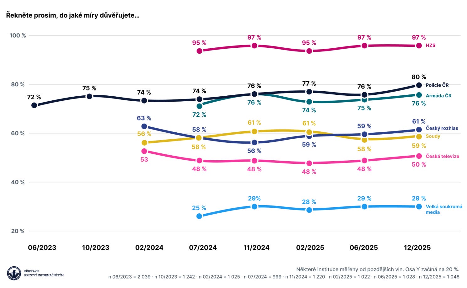 Po hasičích, policistech a vojácích ale data ukazují zlom. Soudům a Českému rozhlasu důvěřují dvě třetiny obyvatel, České televizi polovina a velkým soukromým médiím nanejvýš třetina. V mezinárodním srovnání ale tento rozdíl nepředstavuje žádnou výjimku. V důvěře v instituce, které nevidíme ve své každodennosti – parlament, kraje, vládu –, jsme ale oproti zemím OECD podprůměrní.