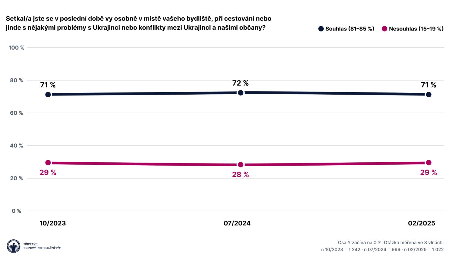 Jak jsme měřili: Osm vln průzkumů na reprezentativních vzorcích dospělé populace, celkem 9 623 respondentů. Opakované měření umožnilo zachytit vývoj klíčových ukazatelů v čase – pocitu bezpečí, zkušeností s agresí, důvěry v instituce, obav z budoucnosti a připravenosti na mimořádné situace.