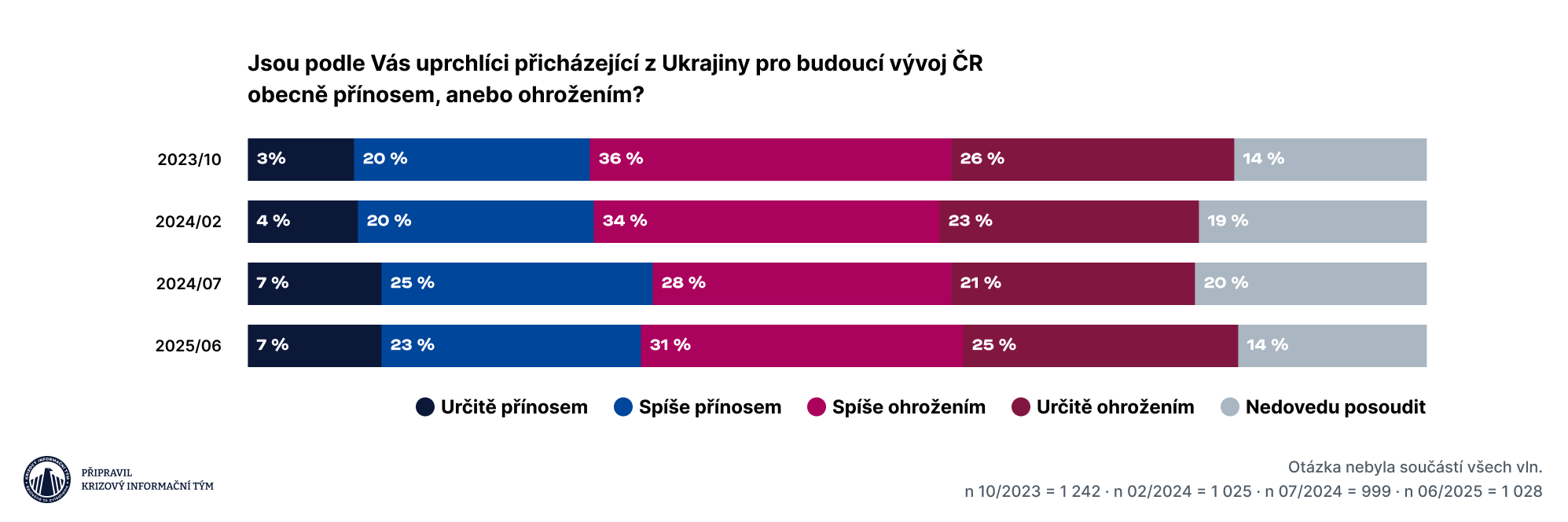 Podíl lidí, kteří se obávali negativního vlivu Ukrajinců na dění v ČR, mezi lety 2024 a 2025 posílil: