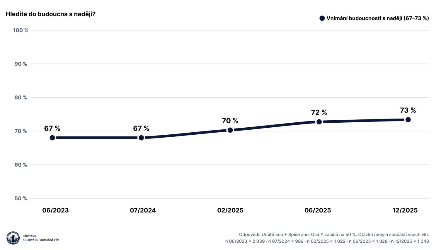 Navzdory těmto obavám ale většina z nás hleděla do budoucna s nadějí. Podíl optimistů za ty dva a půl roku dokonce narostl ze 67 na 73 %.