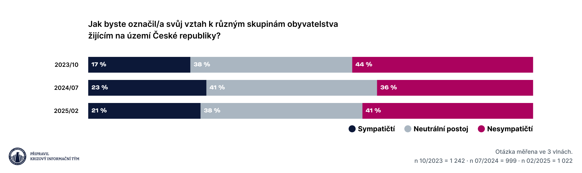 Míra sympatií k Ukrajincům byla u nás před zahájením ruské invazí velmi nízká – jako společnost jsme se na Ukrajince dívali dosti svrchu. Dnes jsou tyto sympatie vyšší, ale ve srovnání s většinou jiných etnických skupin žijících na našem území stále podprůměrné. Negativní postoj k Ukrajincům (36-44 %) po celé období převažoval nad pozitivním (17-23 %).