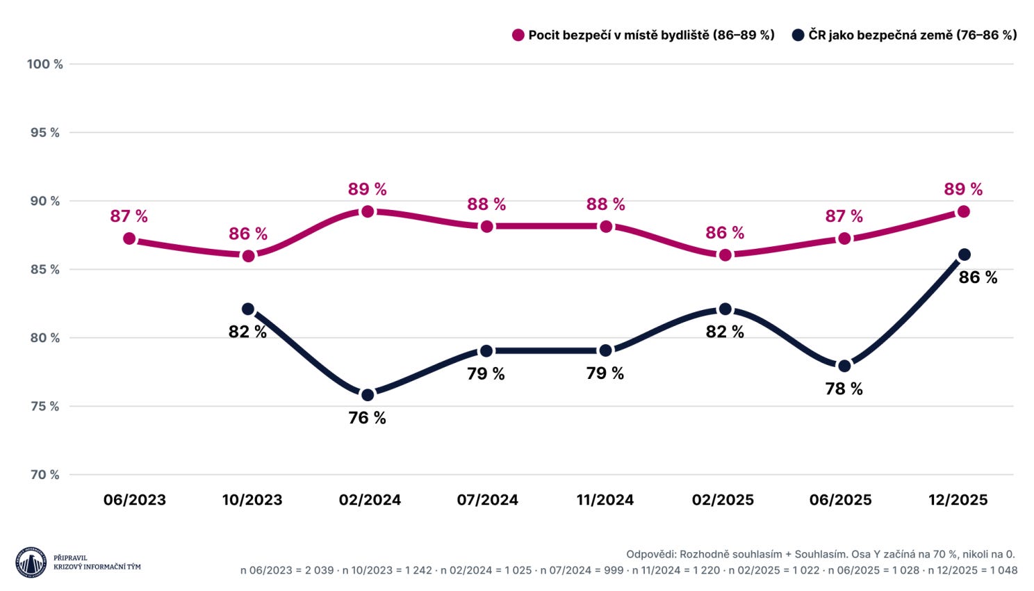 Když ukazatele shrneme: cítíme se bezpečně, bezpečnostním institucím důvěřujeme a do budoucna hledíme s křehkým optimismem. Riziko vidíme v důvěře v instituce, které nemáme na očích každý den – soudy, parlament, vládu – a v rostoucím rozdílu mezi tím, co skutečně zažíváme, a tím, co se děje ve veřejné diskusi.
